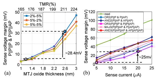 Reliability: We assess the variation tolerance in the proposed sub-array and SA circuit by running a Monte Carlo simulation. We run the simulation for 10,000 iterations considering two sources of variations in SOT-MRAM cells: first, a process variation on the Tunneling Magnetoresistance (TMR) and, second, a variation on the Resistance–Area product (RAP). The results illustrated in Figure 4b prove that the sense margin reduces by increasing the number of selected input cells for in-memory operations. We observe the sense margin for three-input in-memory logic is relatively small, wherein the P//P//P and P//P//AP margin shows a minimal ∼3mV margin. Such a sense margin could be enhanced by either increasing oxide thickness () or the sense current, but obviously by imposing more power consumption. To show this, we first explore such a worst-case scenario in a 3-input logic voltage margin considering the different stochastic variations on MTJ’s RAP/TMR (2%/5%, 5%/2%, and 5%/5%) in Figure 6a by increasing , from 1 nm to 3 nm, as experimentally demonstrated in [35]. We correspondingly plot the TMR values achieved from our experimentally benchmarked model in the top x-axis. Note that is set to 5 A. We observe increasing from 1.2 nm to 2.6 nm (corresponding to 171.2% to 211% increase in TMR value) increases the sense margin by ∼28.4 mV, which considerably improves the reliability of the OR3 operation in PANDA. Such an increase in TMR will enlarge the margin for MAJ and AND3 operations as well. Furthermore, we performed an extensive circuit-level Monte Carlo statistical analysis to investigate the process variation effects on the triple row activation mechanism considering ±10% variation and noises in different components of the MRAM array, such as RBL capacitance, SOT-MRAM bit-cell’s access transistor, and SA (width/length of transistors). Figure 6b shows the experiment results of the sense voltage margin for memory read, and all supported 2-/3-input in-memory operations with a Gaussian-distributed variation (3) added to the parameters. We gradually increase the to plot the impact of sense current in the process. We observe that the larger is, the larger the voltage margin achieved for different operations. Based on this, a ∼15 A increase in sense current will lead to a ∼25 mV increase in the OR3 case.