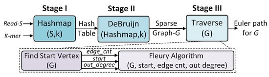 The genome assembly algorithm consists of three main stages, as visualized in Figure 7. First, breaking down each short read in the sequence into smaller chunks of k-mers in a consecutive manner and keeping the frequency of each distinct k-mer in a Hashmap; second, generating a de Bruijn Graph out of the Hashmap; third, traversing through the de Bruijn Graph to reconstruct the entire genome using the Euler Path traversal concept (stages II and III are so-called contig. generation). There is a final stage called scaffolding to close the gaps between contigs, which is the result of the de novo assembly [2].