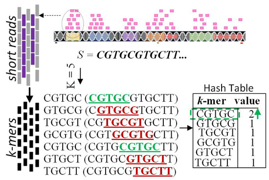 - Georganas, E.; Buluç, A.; Chapman, J.; Oliker, L.; Rokhsar, D.; Yelick, K. Parallel de bruijn graph construction and traversal for de novo genome assembly. In Proceedings of the SC’14: Proceedings of the International Conference for High Performance Computing, Networking, Storage and Analysis, New Orleans, LA, USA, 16–21 November 2014; IEEE: New York, NY, USA, 2014; pp. 437–448. [Google Scholar]