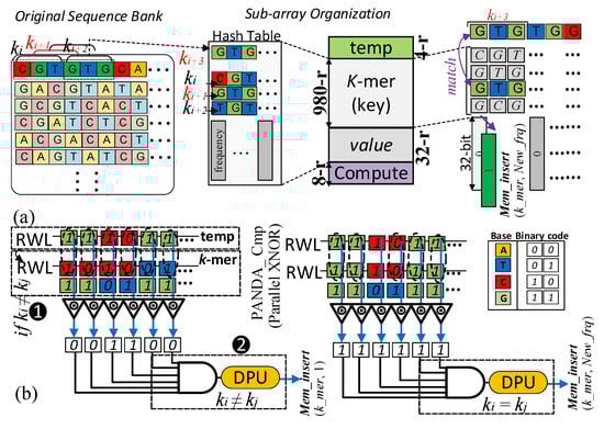(a) The proposed correlated data partitioning and mapping methodology for creating a hash table, (b) realization of the parallel in-memory comparator (PANDA_Cmp) between k-mers in a computational sub-array.