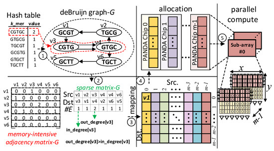 The next step is to construct and access the de Bruijn graph based on the pre-generated Hash structure. Each “key” in the Hashmap is a k-mer, where the “value” associated with it is the total occurrence of the k-mer in the genome sequence. To represent a k-mer in the de Bruijn graph, each k-length string will be divided into two nodes: one with the prefix of length 1 and the other with the suffix of length 1 (e.g., CGTGC → CGTG and GTGC), and therefore, a directed edge will be connected between the two nodes from left to right. Likewise, k-mers with frequency n will be connected with n edges. The de Bruijn graph G for the sample hash table in Figure 8 is constructed and illustrated in Figure 10 (step 1). Algorithm 2 shows the construction of the de Bruijn graph for PANDA, taking the Hashmap and k as inputs and returning the output graph G. For each key in the hash table, the PANDA_Mem_insert instruction creates an entry in G for node1 and node2s. Leveraging adjacency matrix representation for the direct mapping of such a humongous sparse graph into memory comes at a cost of significantly increased memory requirement and run time. The size of the adjacency matrix will be V × V for any graph with V nodes, where a sparse matrix could be represented by a 3 × E matrix, where E is the total number of edges in the graph. PANDA utilizes sparse matrix representation shown in Figure 10 (step 2) for mapping purpose. Each entry in the third row of the sparse matrix represents the number of connections between two nodes in the first and second rows.