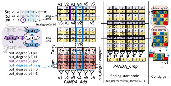 In the interest of space, we show out_/in_degree and edge_cnt mapping and computation in the PANDA platform in Figure 11, which basically sums up all the entries of a particular node i of valid links connected to a vertex to find the start vertex. As can be seen, we use the sparse matrix representation to store the matrix-G. In our mapping technique, each column is assigned to a distinct source vertex in the graph and then filled out with the number of edges (#E) only linked to existing destination vertices in a vertical fashion. Therefore, we do not assign destination vertices to the memory rows as in direct adjacency matrix mapping. Here, we consider a 4-bit representation for the simplicity. For example, v4 has outgoing edges to v2 and v6 that are stored vertically in a sub-array. PANDA could perform parallel in-memory addition to calculate the total number of out_ degrees for all nodes in parallel. For this task, two rows in the sub-array are initialized to zero as Carry reserved rows such that they can be selected along with two operands (here v4 → v2 data (0001) and v4 → v6 data (0001)) to perform parallel in-memory addition. To perform parallel addition operation and generate initial Carry and Sum bits, PANDA takes every three rows to perform a parallel in-memory addition. The results are written back to the memory reserved space (Resv.). Then, the next step only deals with the multi-bit addition of resultant data starting bit-by-bit from the LSBs of the two words and continuing towards MSBs. Then PANDA is able to perform a comparison between a number of out_degree and in_degree for each node in parallel to determine the start node. After finding the start node as shown in Figure 11, contig. generation can be readily accomplished by finding the Eulerian path and putting together each vertex data from different sub-arrays.