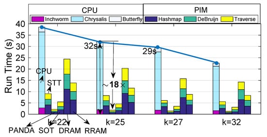 The breakdown of run time for under-test platforms running different k-mer length genome assembly task. In each bar group from left to right: CPU, processing in STT-MRAM [41], PANDA, processing in SOT-MRAM [6], processing in DRAM [12], and processing in RRAM [42].