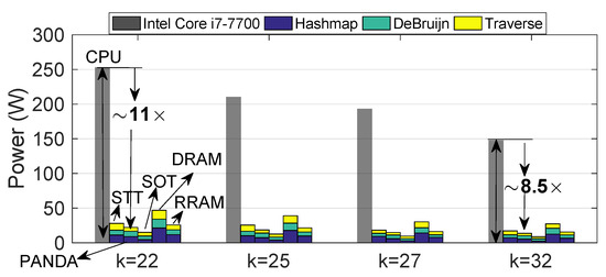 We estimated the power consumption of different PIM platforms for running different length k-mers compared to the CPU platform as shown in Figure 14. Based on our results, a significant reduction in power consumption can be reported for all under-test PIM platforms compared with the CPU. The breakdown of energy consumption is also shown for the PIM platforms; however, this could not be accurately achieved for the CPU and overall power consumption is reported. In our experiment, processing in SOT-MRAM design [6] achieves the smallest power consumption (on average) to run the three main procedures, as compared with the CPU and other PIM platforms. The PANDA platform stands as the second most power-efficient design. This is mainly due to the three-SA-based bit-line computing scheme in PANDA compared with the two-SA per bit-line technique in the counterpart design; while the proposed scheme brings more speed-up compared with the design in [6], it requires relatively more power. PANDA reduces power consumption by ∼9.2× on average compared with the CPU platform over different length k-mers. Moreover, it reduces the power consumption by ∼18% compared with the STT-MRAM [41] platform. The main reason behind this improvement is more efficient addition operation in PANDA. The addition operation requires additional memory cycles in the STT-MRAM [41] platform to save and carry the bit back to the memory and use it again for the computation of the next bits. Compared to DRAM and RRAM platforms, PANDA obtains on average 2.11× and 55% power reduction for various length k-mer processing.