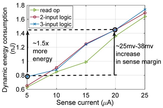 We estimated the energy consumption imposed by the sensing circuit at the sub-array level in order to analyze the adverse impacts of boosting the sense current for read, 2-input, and 3-input PIM operation as a follow-up discussion to the reliability part in Section 2.4. Figure 15 shows that by increasing the sense current, the sub-array’s dynamic energy will increase correspondingly. Our experiment shows that to increase the average sense margin by ∼25–38 mv, the PANDA’s computational sub-array consumes ∼1.5× more energy. This could be considered a significant factor in designing sensing circuitry.