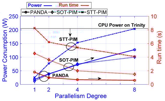 We investigate the power efficiency and speed-up of the three best under-test PIM platforms, based on the run time and power consumption results in the previous subsections, by tuning the number of active sub-arrays () associated with the comparison and addition operations. A parallelism degree () can then be defined as the number of replicated sub-arrays to boost the performance of the PIM platforms through parallel processing, as shown in prior works [6,15]. For example, when is set to 2, two parallel sub-arrays are undertaken to process the in-memory operations, simultaneously. We expect such parallelism to improve the performance of genome assembly at the cost of sacrificing the power consumption and area. Figure 16 plots the existing trade-off between run time and power consumption vs. for k = 25. The estimated CPU power budget required to execute Trinity is also shown. It can be seen that for all platforms the run time reduces by increasing the parallelism. For example, for the PANDA platform in an extreme case, increasing from 1 to 8 increases the power consumption from ∼19 W to 128 W (∼7×) and reduces the execution time by a factor of 3, which might not be a favorable case. Therefore, a user can meticulously tailor the PANDA performance to meet the system/application constraints. Here, we show the optimum theoretical performance of PANDA and other PIM platforms by pinpointing the intersection between power and run time curves in Figure 16. We observe that PANDA achieves the smallest run time and power consumption task with a 2 compared with the others.