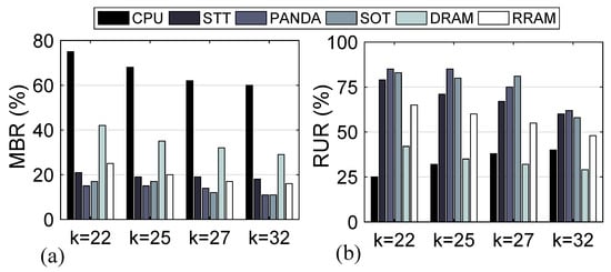 The power efficiency and speed-up of PIM platforms against the von Neumann architecture-based CPU were discussed in prior subsections. Here, we further explore the reasons behind the numbers reported by considering two new measures, i.e., Memory Bottleneck Ratio (MBR) and Resource Utilization Ratio (RUR). We define MBR as the time fraction needed for data transfer from/to on-chip or off-chip when the computation has to wait for data, i.e., memory wall happens. We also define RUR as the time fraction in which the computation resources are loaded with data. The memory wall is considered as the main bottleneck that brings large power consumption and lengthens execution time in the CPU. The MBR is reported in Figure 17a. The peak throughput for each design in four distinct k-mer lengths is taken into account for performing the evaluation. This evaluation mainly considers the number of memory accesses. As shown, the PANDA uses less than ∼17% time for data transfer due to the PIM acceleration schemes, while CPU’s MBR increases to 65% when k = 25. Moreover, we observe that all the other PIM platforms except DRAM also spend less than ∼17% time for data communication. The smaller MBR can be translated as the higher RUR for the accelerators plotted in Figure 17b. The lower MBR can be understood as a higher RUR. We can see that with up to ∼82%, PANDA achieves the highest RUR. Taking everything into account, PIM acceleration schemes offer a high utilization ratio (>60% excluding DRAM) confirming the conclusion drawn in Figure 17a. The memory wall evaluation shows the efficiency of the PANDA platform for solving the memory wall challenge.