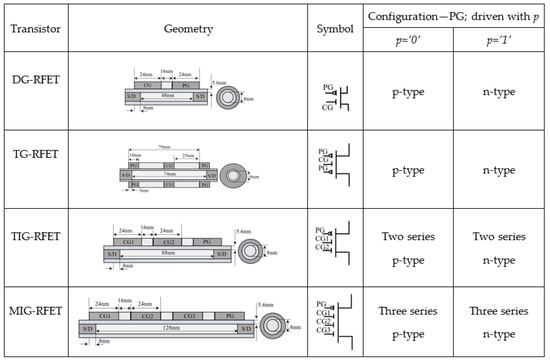 Figure 1 illustrates the functionalities of recently proposed RFETs. The Dual-Gate (DG) RFET [,] is based on an axial silicon nanowire heterostructure (metal/intrinsic silicon/metal) that uses Schottky junctions as independent gates. The three-gate (TG) RFET [] exploits a monolithic Al-Ge-Al heterostructure and relies on two omega-shaped top gates surrounding the Source/Drain channel junctions to alter the device’s operation between p- and n-type. Three-Independent-Gate (TIG) RFETs and a Multiple-Independent-Gates (MIG) RFET have been also investigated and demonstrated by simulation [].
