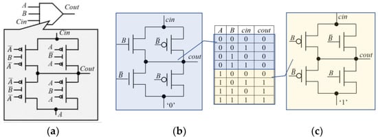 In Figure 3a, the reconfigurability of the RFETs is exploited to design a static, compact MG. In this case, the logic function does not change, but the circuit adapts itself to comply with different combinations of the inputs. Figure 3b,c illustrate the equivalent circuits and their behavior for A = ‘0’ and A = ‘1’. It is important to note that when A ≠ B, the output signal of the MG is fed by Cin through the S/D terminals of one of the upper TG-RFETs, which therefore acts as a pass transistor. As a consequence, when multiple MGs are cascaded, as in the RCA illustrated in Figure 4, series-connected pass transistor RFETs negatively affect the computational time. The same is true for the conventional RFET-based multiplexer scheme. Therefore, when several multiplexers are cascaded, a detrimental effect on the propagation delay is observable. As shown in the following, the new MG presented here avoids such a detrimental effect, thus improving the global speed performance of the realized RCA.