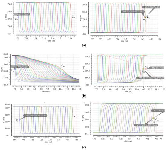 Table 2 shows that with n doubling, the worst addition time (i.e., Cn-C0) of the CMOS and the new RCA almost doubles, whereas the Cn-C0 delay of the TG-FET RCA [] more than triples, thus leading to a more rapid performance decay versus the operand’s bit-width. As expected, this is due to the carry propagation involving n cascaded pass-transistor RFETs. When performing the critical 32-bit addition, the internal carry signals, the sum bits, and the carry-out of the compared adders switch, as plotted in Figure 6.