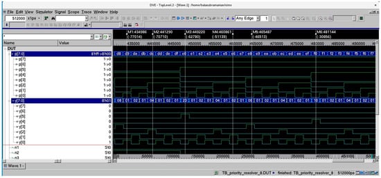 A functional simulation of an 8-bit priority resolver was performed using Synopsys VCS by supplying all possible distinct input vectors, i.e., 256 input vectors for verification. The input vectors were supplied by a test bench at a latency of 2 ns. Figure 2 shows a screenshot of a portion of the simulation waveforms of the 8-bit priority resolver that was synthesized using a 28 nm CMOS standard digital cell library []. In Figure 2, bus p[7:0] encompassing inputs p[7] up to p[0] represents the primary input, and bus y[7:0] encompassing outputs y[7] up to y[0] represents the primary output.
