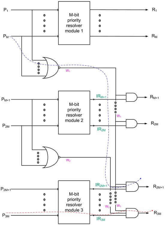 Referring to Figure 3, to explain the modular design architecture, if any of the primary inputs of module 1 are activated, the output of the first M-bit NOR gate. viz. W1, would become 0. As a result, RM+1 up to R2M (representing the outputs of priority resolver module 2) and R2M+1 up to R3M (representing the outputs of priority resolver module 3) would become 0, regardless of whether any of their primary input(s) were activated. Supposing that none of the primary inputs of module 1 are activated, W1 would become 1, and the highest priority will now be passed to module 2. Under this condition, even if any one of the primary inputs of module 2 is activated, W2 would become 0, and hence, R2M+1 up to R3M (representing the outputs of priority resolver module 3) would become 0 regardless of whether any of its primary inputs were activated. If any module input is activated, the primary outputs belonging to modules with a lower priority would become 0 regardless of the active/inactive state of their corresponding primary inputs. This principle can be used to combine small-size priority resolver modules to realize medium- or large-size priority resolvers along with extra logic, as illustrated by the example realization shown in Figure 3.