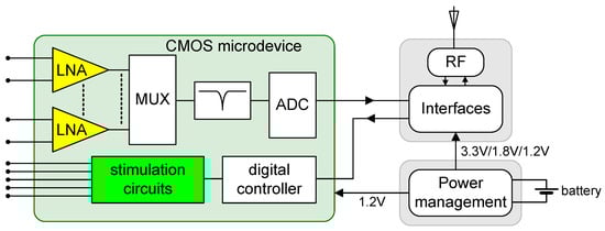 Block diagram of a system for applications in CLBDS. The system is composed of a power management module, a communications module, and the CMOS microdevice, containing the acquisition blocks, the neurostimulator, and the control block. The proposed circuits, LNA, and the neurostimulator are filled with the yellow and green colors, respectively.