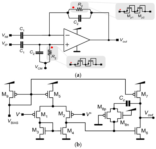 Schematics of (a) an LNA and (b) the operational amplifier. The red dots on (a) indicate how the pseudo-resistors connects to the operational amplifier.