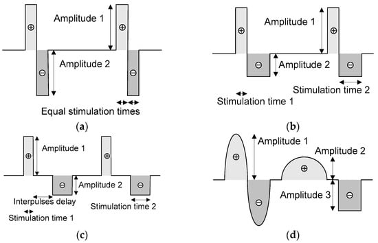 Neurostimulators must preferably provide current pulses with a biphasic shape because of electrical safety reasons, such as avoiding the accumulation of charges at interfaces between electrodes and ionic species within the neuronal tissue [23]. Figure 3 illustrates four examples of pulse shaping, where the duration (or stimulation times), frequency, amplitudes, and inter-pulse delay of the pulses can be set according to medical requirements. The mean value of these signals is zero in all the examples, thanks to the arbitrary pulse shaping.
