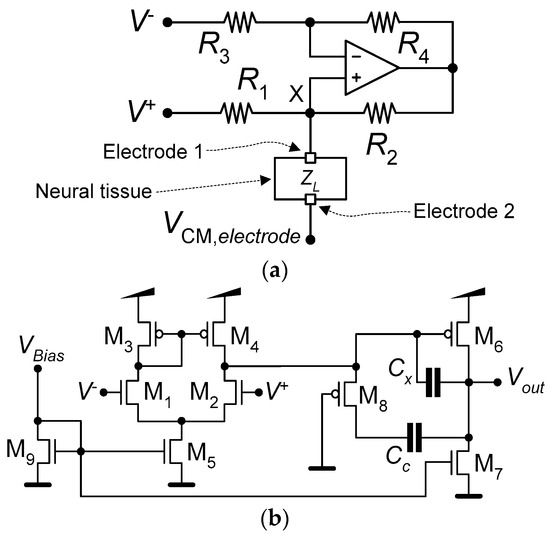 Figure 4a shows the schematic of the current pump that implements the neurostimulator. The neurostimulator is composed of an operational amplifier and four resistors {R1, R2, R3, R4}, all fully implemented using the mask layers of the TSMC 65 nm CMOS process. Figure 4b presents the schematic of the operational amplifier used by the current pump. Table 2 lists the dimensions of the MOSFETs, the values of the operational amplifier’s internal capacitances, Cc and Cx, and the values of the current-pump’s resistors.