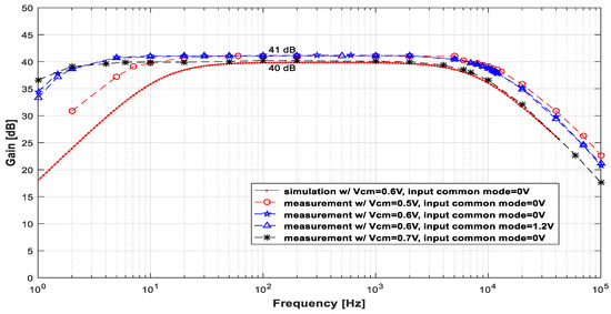 Figure 6 displays the measured gain × frequency curve for several common-mode voltages (VCM), different input common modes, and input signals with an amplitude of 2.2 mVpp. In this set of plots, the simulation results are also shown (dotted red line) to allow for comparisons. The measurements, in general, agree well with the simulation results. The most noticeable difference between the simulated and experimental results is the positions of the cutoff frequencies. The variation in these parameters is not surprising because fL depends on the pseudo-resistor, for which the value is difficult to estimate accurately, and fH depends on the transistors’ (M1 and M2’s) transconductance parameter (gm), which varies considerably in a process.