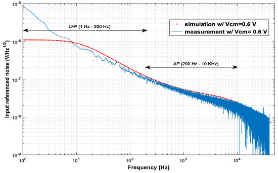 Figure 7 presents the measurement and simulation results of the input-referenced noise. The agreement between measurements and simulations is quite good for frequencies above 12 Hz, which is the low cutoff frequency found in the simulations. Below this frequency, the measured noise continues to increase because the cutoff frequency of the implemented LNA is at 1.5 Hz. The measured IRNs are 6.48 μVRMS from 1.5 Hz to 200 kHz, 3.45 μVRMS from 200 Hz to 11.5 kHz, and 7.36 μVRMS from 1.5 Hz to 11.5 kHz.