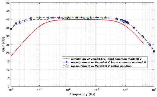 This LNA was also tested with a saline solution to emulate an ex vivo situation and evaluate its performance in real in vivo applications. Figure 8 presents the measured gains for signals injected into the saline solution. The amplitudes of the injected signals were adjusted to obtain approximately 5 mVpp at the LNA input. The voltage value of the generator output ranged between 6 mVpp and 20 mVpp, depending on the frequency.
