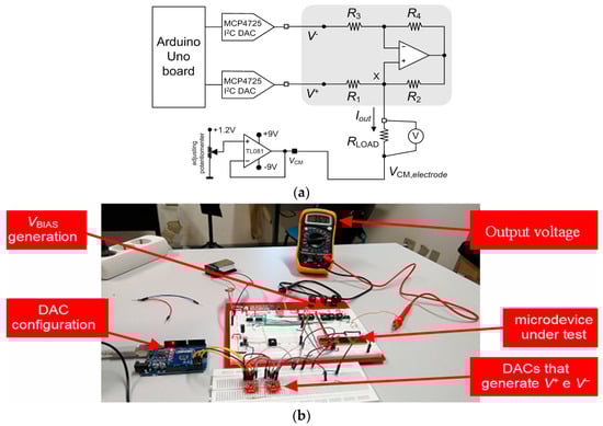 Figure 9a illustrates the schematic of the experimental setup for the static characterization of the neurostimulator circuit. This setup comprises a voltage follower, implemented with the operational amplifier (TL084), to generate the common-mode voltage (VCM,electrode) applied in the reference terminal of the electrode. The implantable electrode is represented by the load resistor (RLOAD).