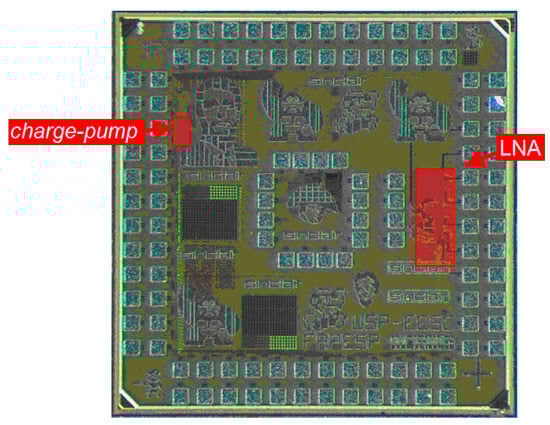 Photograph of the fabricated CMOS microdevice (1.8 mm × 1.8 mm), with emphasis on the LNA and the current pump presented in the paper.