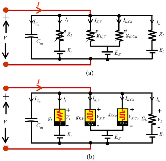 Typical Chay neuron model of an excitable cell [30]. (a) Electrical circuit model, following conventional assumption as time varying conductances [1]. (b) Equivalent memristive Chay model based on Chua’s memristive theory [2,3,4]. The potential ECa for Ca2+ ion given in the rate of the calcium concentration in Equation (3) is not an external battery source and not shown in external (a) and (b), respectively.