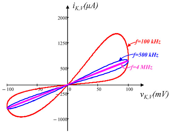 Pinched hysteresis loops of voltage-sensitive potassium ion channel memristor at frequencies f = 100 KHz, 500 KHz, and 4 MHz for the input signal vK,V(t) = 100sin(2πft) mV.