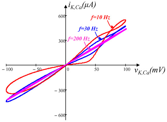 Let us verify the fingerprint of the frequency-dependent pinched hysteresis loops of the calcium-sensitive potassium ion channel by applying the sinusoidal voltage source vKCa(t) = 100sin(2πft) mV with frequencies f = 10 Hz, 30 Hz, and 200 Hz, respectively. Observe from Figure 4 that all the zero-crossing pinched hysteresis loops shrink as the frequencies of the input signal increases and tend to a straight line for the frequency f = 200 Hz. All of the pinched hysteresis fingerprints confirm that the calcium-sensitive potassium ion channel is a generic memristor.