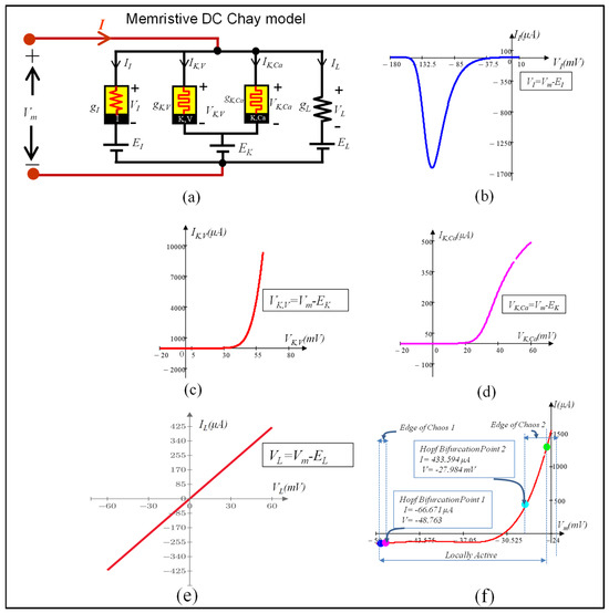(a) Memristive DC Chay model at equilibrium voltage Vm. (b) DC V-I curve of a mixed ion channel nonlinear resistor at equilibrium voltage VI = Vm − EI. (c) DC V-I curve of voltage-sensitive potassium ion channel memristor at equilibrium voltage VK,V = Vm − EK. (d) DC V-I curve of the calcium-sensitive potassium ion channel memristor at equilibrium voltage VK,Ca = Vm − EK. (e) DC V-I curve of the leakage channel at equilibrium voltage VL = Vm − EL. (f) Plot of the DC V-I curve of the memristive Chay model at membrane voltage Vm.