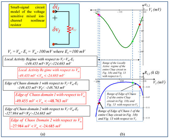 (a) Small-signal circuit model of the voltage-sensitive mixed ion channel nonlinear resistor about the DC equilibrium point QI (VI, II). (b) Plot of the coefficient a12 and resistance R1,I as a function of the DC equilibrium voltage VI = Vm − EI, where EI = 100 mV. R1,I < 0 over the range of local activity, edge of chaos 1 and edge of chaos 2 of the mixed ion channel nonlinear resistor is identified with respect to VI of the entire Chay circuit in Figure 1b and Figure 16.