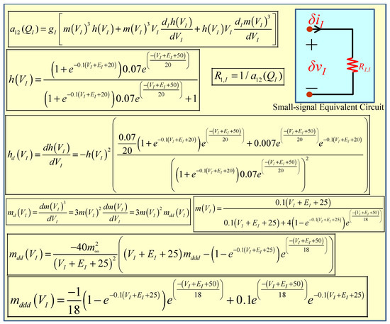 From Equation (34), it is clear that the small-signal admittance function of the mixed ion channel nonlinear resistor is equivalent to that of a linear resistor. The corresponding small-signal equivalent circuit and a plot of the coefficients a12(QI) and resistance R1,I as a function of the DC equilibrium voltage VI = Vm − EI, where EI = 100 mV, are shown in Figure 6a and Figure 6b, respectively. The explicit formulas for computing coefficient a12(QI) are given in Figure 7 for readers’ convenience.