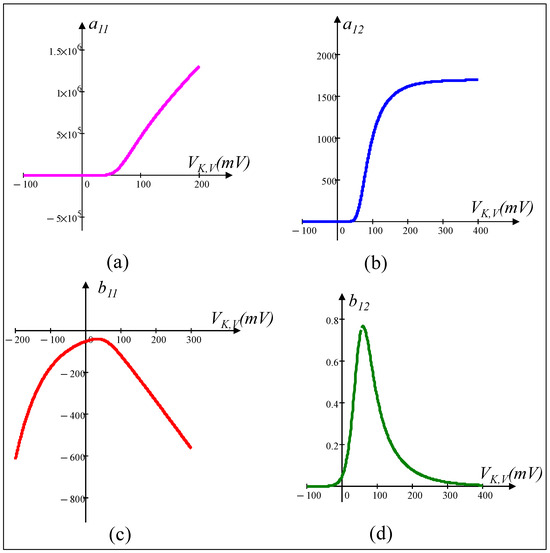 Plot of coefficients (a) a11, (b) a12, (c) b11, and (d) b12 of the voltage-sensitive potassium ion channel memristor as a function of the DC equilibrium voltage VK,V.