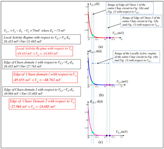 (a) Inductance LK,V (b) resistance R1K,V and (c) resistance R2K,V of the voltage-sensitive potassium ion channel memristor as a function of DC equilibrium voltage VK,V = Vm − EK where EK = −75 mV. LK,V > 0, R1KV > 0 and R2KV > 0 shown in figures over the local activity, edge of chaos 1 and edge of chaos 2 are just corresponding range of the voltage with respect to VK,V of the entire connected Chay small signal equivalent circuit of Figure 1b and Figure 16.