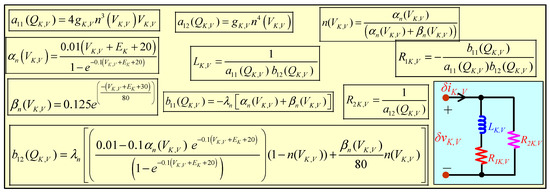 It follows from Equations (55)–(57) that the small-signal admittance function of the first-order voltage-sensitive potassium ion channel memristor is equivalent to the series connection of an inductor and a resistor in parallel with another resistor, as shown in Figure 8. The corresponding coefficients a11, a12, b11, b12, inductance LK,V, resistance R1K,V, and resistance R2K,V as a function of the DC equilibrium voltage VK,V = Vm − EK, where EK = −75 mV are shown in Figure 9 and Figure 10, respectively. Please note that the local activity, edge of chaos 1, and edge of chaos 2, shown in Figure 10a–c, are not the local activity and edge of chaos domains of the separate two terminals of the voltage-sensitive potassium ion channel memristor. The small signal positive inductance and resistances (i.e., LK,V > 0, R1K,V > 0, and R2K,V > 0) of the potassium ion channel memristor observed over the local activity, edge of chaos 1 and edge of chaos 2 regime are just the corresponding range of the voltage with respect to VK,V of the entire connected Chay small-signal equivalent circuit of Figure 1b and Figure 16. For the readers’ convenience, the explicit formulas for computing the coefficients a11(QK,V), a12(QK,V), b11(QK,V), b12(QK,V), and LK,V, R1K,V, and R2K,V are summarized in Figure 11.