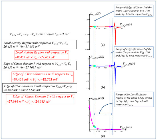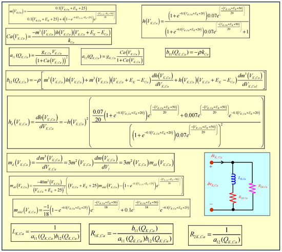 It follows from Equations (77)–(79) that the small-signal admittance function of the first-order calcium-sensitive potassium ion channel memristor is equivalent to the series connection of an inductor and a resistor in parallel with another resistor, as shown in Figure 12. The corresponding coefficients a11, a12, b11, b12, and inductance LK,Ca, resistance R1K,Ca, and resistance R2K,Ca as a function of the DC equilibrium voltage VK,Ca are shown in Figure 13 and Figure 14, respectively. The small-signal inductance and resistances (i.e., LK,Ca > 0, R1K,Ca > 0 and R2KCa > 0) over the edge of chaos 1 and edge of chaos 2 with respect to the VK,Ca are shown in Figure 14a, Figure 14b, and Figure 14c, respectively. Please note that the local activity, edge of chaos 1 and edge of chaos 2, shown in Figure 14a–c, are not the local activity, edge of chaos 1 and edge of chaos 2 of the individual calcium-sensitive potassium ion channel memristor. The local activity and edge of chaos domains are just information showing the corresponding range of voltage with respect to VK,Ca when measured across the individual calcium-sensitive potassium ion channel memristor of the entire connected Chay small-signal equivalent circuit in Figure 1b and Figure 16. For the readers’ convenience, the explicit formulas for computing the coefficients a11(Q,K,Ca), a12(QK,Ca), b11(Q,K,Ca), b12(Q,K,Ca) and LK,Ca, R1K,Ca, R2K,Ca are summarized in Figure 15.