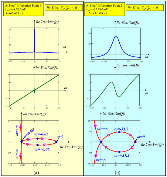 Table 3 illustrates the computation of the potassium ion channel activation n, calcium concentration Ca, and eigen values (λ1, λ2, and λ3) as a function of the DC stimulus current I (resp. membrane potential Vm) at the DC equilibrium point Q. It is observed from Table 3 and Figure 21a,c that the two Hopf bifurcations points 1 and 2 occur at Vm = −48.763 mV (resp. I = −66.671 μA) and Vm = −27.984 mV (resp. I = 433.594 μA), respectively, where the eigen values are purely imaginary at these two equilibria. As I decreases (resp. Vm decreases) from Hopf bifurcation point 1, the eigen values migrate to the left-hand side, confirming the real parts of the eigen values are no longer positive and thereby confirming the first negative real eigen values regime exists over the following interval.