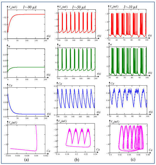 Patterns of oscillations when stimulus current I is chosen beyond and inside the bifurcation points. (a) DC pattern observed when I = −90 µA chosen beyond bifurcation point 1 (I = −66.671 μA). Different patterns of oscillations occur when I is chosen between the two bifurcation points I = −66.671 μA and I = 433.594 μA at (b) I = −50 μA and (c) I = −10 μA.