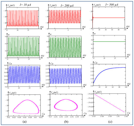 Patterns of oscillations when stimulus current I is chosen inside and beyond the bifurcation points. Oscillation patterns when I is chosen between the two bifurcation points I = −66.671 μA and I = 433.594 μA, at (a) I = 10 μA, and (b) I = 200 μA. (c) The DC pattern when I = 500 μA is chosen beyond bifurcation point 2 (I = 433.594 μA).