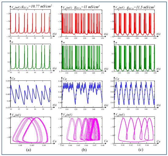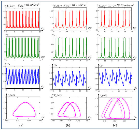 Different patterns of oscillations when gKCa varied from 10 mS/cm2 to 10.75 mS/cm2 at DC situmulus current I = 0. (a) Period-1 oscillation at gK,Ca = 10 mS/cm2 (b) Period-2 oscillation at gK,Ca = 10.7 mS/cm2 (c) Period-4 oscillation at gK,Ca = 10.75 mS/cm2. The simulations were performed at the initial conditions Vm(0) = −50 mV, n(0) = 0.1, and Ca(0) = 0.48.