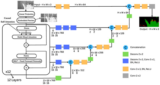 The encoder shown in Figure 3 below and in Figure 1 [19] comprises a positional encoding layer, a stack of encoding layers that make up the encoder, and the causal attention and feed-forward layers. The encoder reads input signals and generates representations of the input data after it has learned the sequence representations of the input volume and effectively captured the global multi-scale information. The decoder, on the other hand, generates output word by word, based on the output signal representation, in the form of tokenized patches generated by the encoder. The vanilla decoder model comprises a stack of decoder layers and a positional encoder. The decoder layers contain global self-attention/cross-attention and feed-forward layers. The encoder and decoder are used to build the transformer model. In this work, we replace the decoder section with a U-NET decoder.