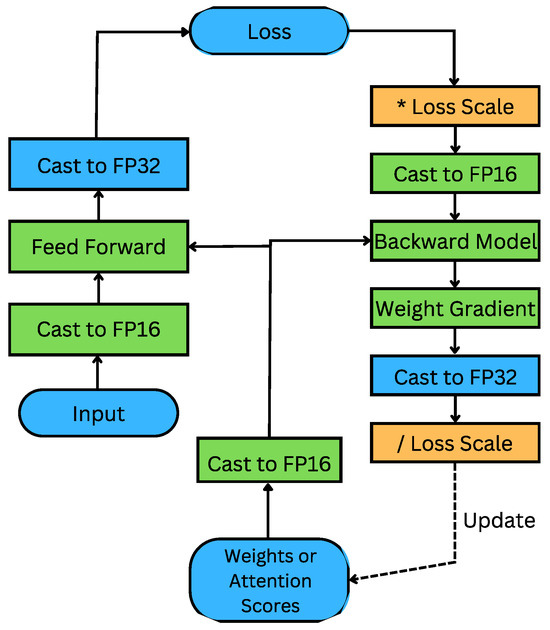 In our framework, we utilized the APEX AMP (automatic mixed precision) PyTorch extension to implement mixed precision seamlessly with minimal code in Nvidia A100 GPU. Figure 6 illustrates the concept of mixed precision, where FP16 and FP32 values are cast to preserve accuracy. A scale factor of 128, commonly used for loss scaling, is employed to maintain values and accuracy, serving as a constant in our study.