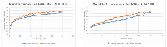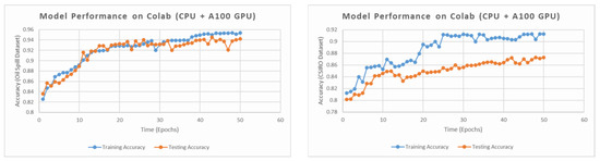After training our model for a total of 50 epochs using NVIDIA A100 GPU on Google Colab, we obtained 91% and 93% training accuracy for the two datasets, as shown in Table 1 below.
