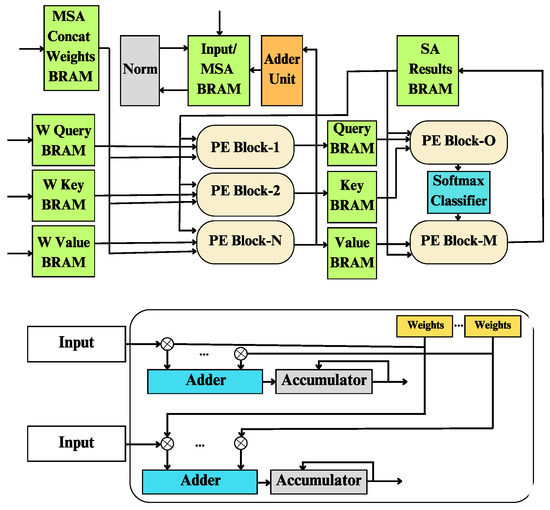 Transformers used for image recognition tasks are commonly called vision transformers. Therefore, our UNETR architecture in Figure 3 can be more precisely referred to as a vision UNETR model. Figure 4 shows how images are encoded by vision transformers [20] for image-related classification tasks. The input image is split into patches that constitute a linear sequence of tokens similar to words in the case of the Bidirectional Encoder Representations from Transformer (BERT) model [21]. The Multiheaded Self Attention (MSA) block involves computing self-attention on each head and finally concatenating the results as shown in (1) to (13). The computation on each head can be parallelized. By observing the data structure of the transformer, we came up with our design of a hardware accelerator.