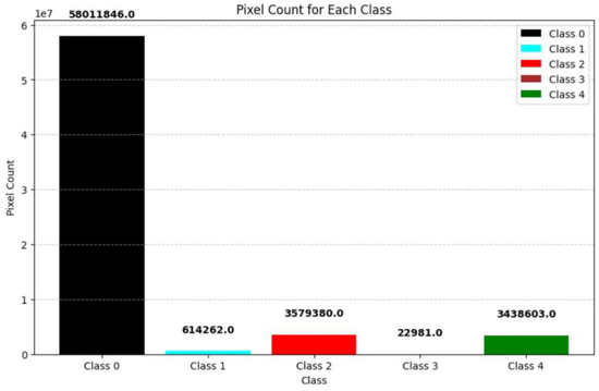 The semantic segmentation technique utilized in this study assigns a class label to each pixel in the image samples from our dataset. Figure 8 illustrates the names of the various classes present in our dataset, while Figure 14 reveals that the ocean (background) constitutes most of the samples. This distribution suggests that our models are more likely to predict class 0 (ocean) accurately because of its predominance among the samples compared with the other classes.