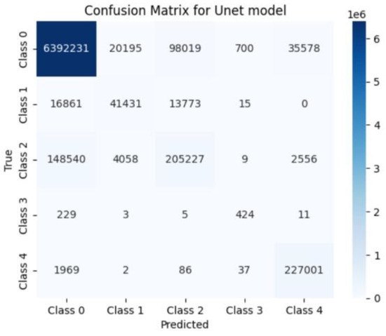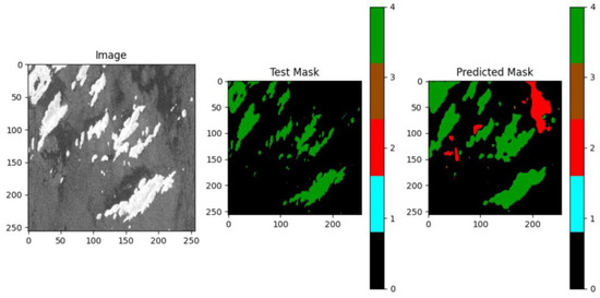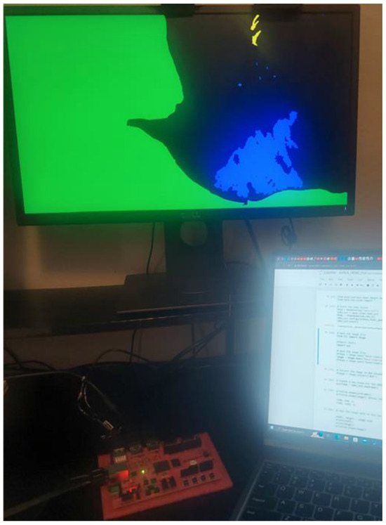 In Figure 15, we evaluate our classification model’s performance using a confusion matrix, specifically focusing on the UNET model. The results indicate that all classes perform well except for class 3 (ship). The UNET model struggles to distinguish between the ocean (class 0) and ships (class 3), frequently misclassifying ships as the ocean. This issue can be attributed to the fact that class 3 has the fewest samples (22,981) in the dataset, as shown in Figure 14, which may be insufficient for the model to generalize effectively with only 50 training epochs. Figure 16 illustrates the differences between the test mask and the predicted mask after training the model for 50 epochs. Finally, we performed inference on FPGA and displayed the results in Figure 17. In the real world, the impacts of chemical spills and contamination are not only prevalent in Cancer Alley but also in other less-developed parts of the world. The results of this study will have far-reaching implications and reduce the cost of monitoring contamination and effectively detecting chemical spills.