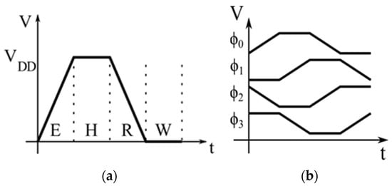 Ideal trapezoidal power clocks for adiabatic logic. (a) Power clock showing relative voltage levels during each phase of operation: evaluate, hold, recover, and wait; (b) four staggered power clocks used in four-phase adiabatic logic, each offset 90 degrees such that the evaluate phase of one clock is during the hold phase of its predecessor.