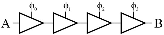 Four successive buffers implemented in four-phase adiabatic logic, buffering a logical value from point A to B, each taking a different power clock in sequence.