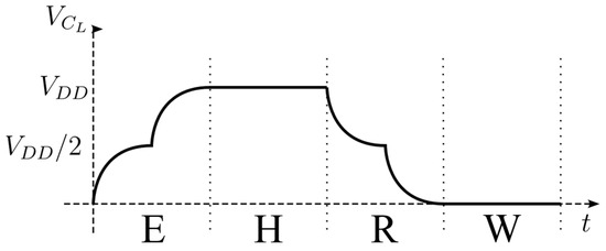 As mentioned previously, for PFAL and ECRL, generation of the ideal trapezoidal waveform is quite difficult and can require carefully tuned resonant circuits. To this end, alternative methods consisting of multiple steps to intermediate voltages in the charging process to mimic the smooth ramp up have been investigated [6,7,8,9,10]. The simplest of these is the two-step charging case illustrated in Figure 4. A switch brings the load capacitance to half the supply voltage during the evaluation phase, dissipating , followed by a second switch to and dissipating another . While nowhere near as efficient as the ideal trapezoidal behavior in (1), the two-step case results in only being lost in each charge or discharge cycle, half that of conventional CMOS.