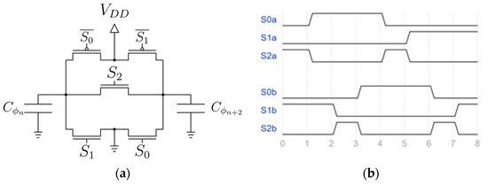 An improved step-charging circuit can be implemented using the circuit shown in Figure 6a. In contrast to the reference work, only two of these circuits are needed, one for each pair of opposite logic phases. Thus, only 10 switching devices and control signals are required, and importantly, no explicit tank capacitors are required. It achieves this by using the load capacitance, , of phase as the tank capacitor for its opposite phase and vice versa in a “self-tanked” fashion.