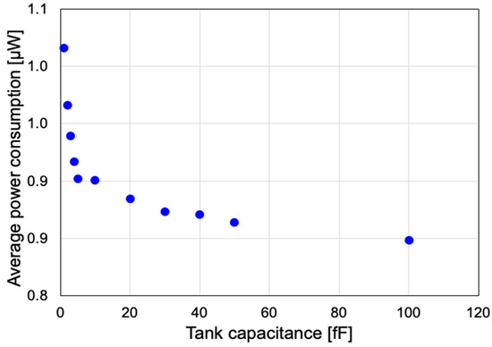 Tank capacitor sweep at 250 MHz operation of the reference driver and test logic circuit. After about 20 fF of tank capacitance on each phase, the circuit hits diminishing returns in regard to power savings.